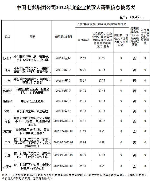 中国电影集团公司2022年度企业负责人薪酬信息披露表-中国文明网