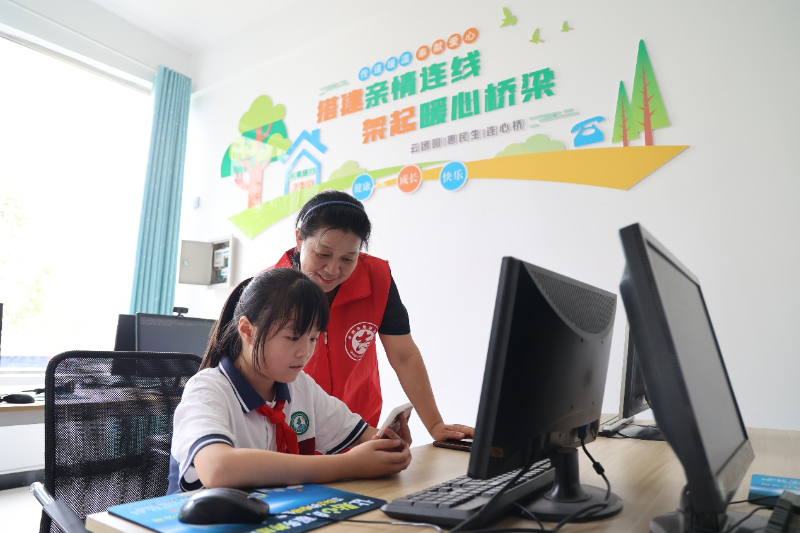 7月21日,在德安县河东乡新时代文明实践所亲情连线室内志愿者正在帮助留守儿童与亲人视频连线。新华网发 陈聚云 摄