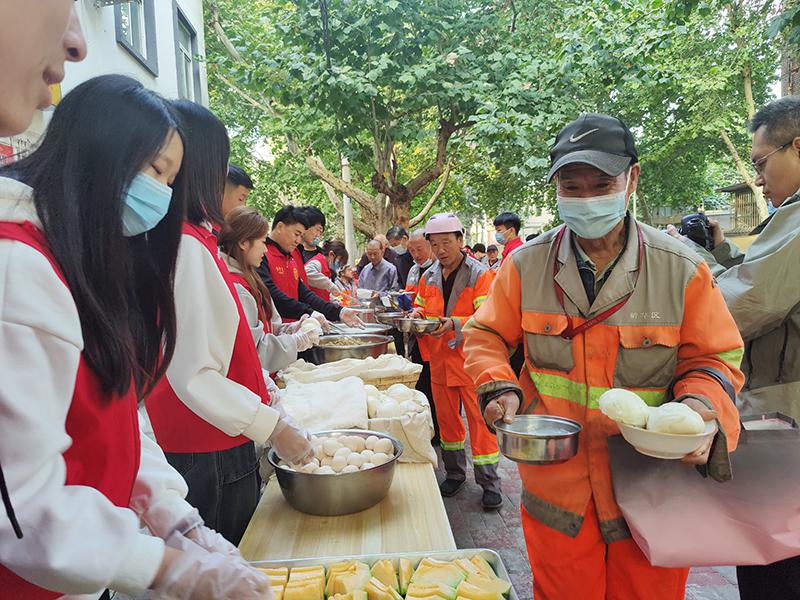 10月14日清晨,在“雪中炭爱心粥屋”门口,环卫工人、社区老人们正在排队领取爱心早餐。新华网 李然 摄