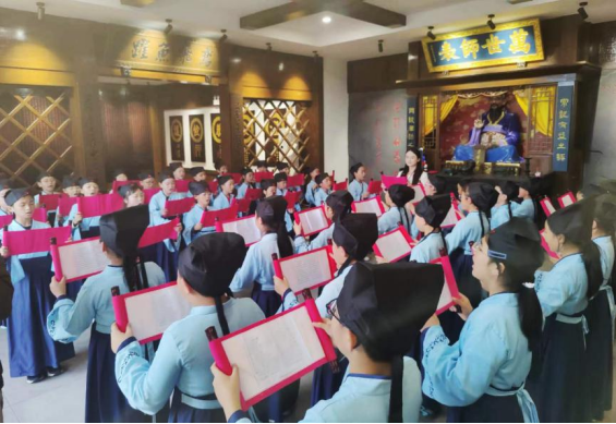 11月2日,身着汉服的孩子们正在达州市渠县文峰书院诵读国学经典。新华网 李然 摄