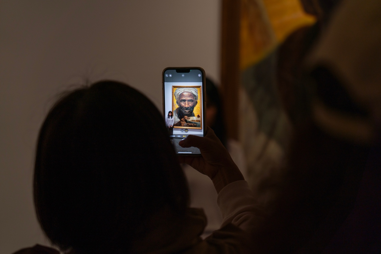 2023年12月12日,游客在广州艺术博物院与馆藏艺术品拍摄合影。新华网 钟奕 摄