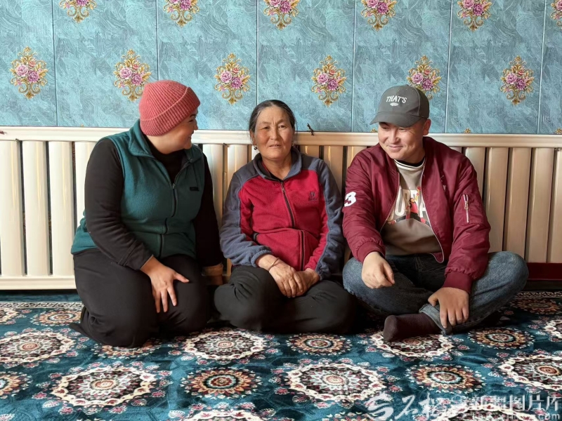 10月23日,朱丽德孜·叶尔兰(左)和婆婆吾木提古丽以及丈夫一起闲聊。石榴云/新疆日报记者 白素君 摄