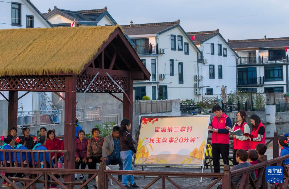 10月25日,江苏省昆山市锦溪镇三联村村干部和村民代表在村头连廊议事(无人机照片)。新华社发(王须中 摄)