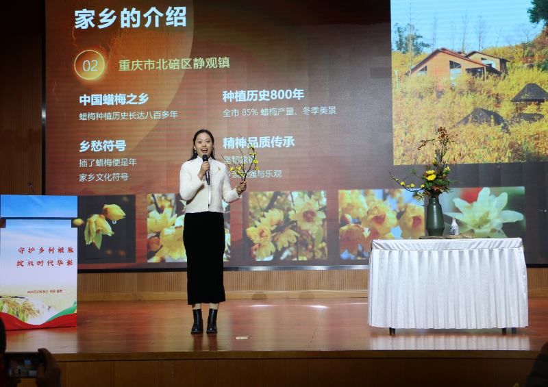 重庆市北碚区静观镇腊梅插花传承人邓纪会讲述非遗故事。姜丽 摄