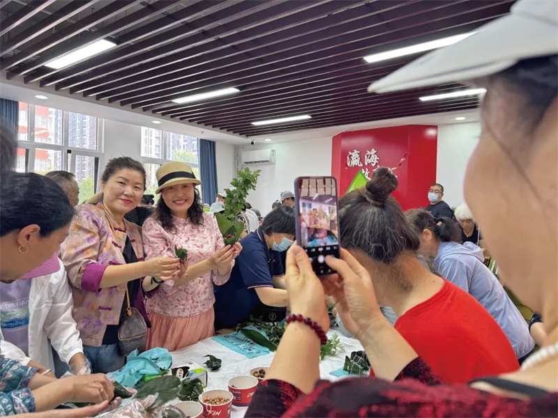 瀛海镇新时代文明实践所举办端午活动,居民包粽子。耿子叶 摄