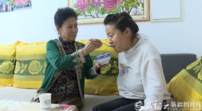 光阴流转,如今芒孜兰姆双鬓染霜,照顾生活无法自理的女儿却从未间断:清晨第一件事是抹药、按摩,喂营养粥,天气好时用轮椅推她出去晒太阳,睡前擦洗身子、检查被褥……35年里,她没睡过安稳觉,没买过新衣服,却把阿依加玛丽打扮得干干净净、漂漂亮亮。在她的照料下,阿依加玛丽从完全无法动弹,到能在搀扶下缓慢行走;从只会呜咽,到能清晰表达爱意。她常说:“妈妈很辛苦,给了我第二次生命!”